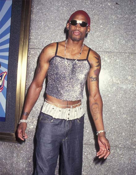 While mainstream fashion was fixed on business casual and timeless minimalism in the 1990s, basketball player Dennis Rodman (above) was known for his boundary-pushing outfits.