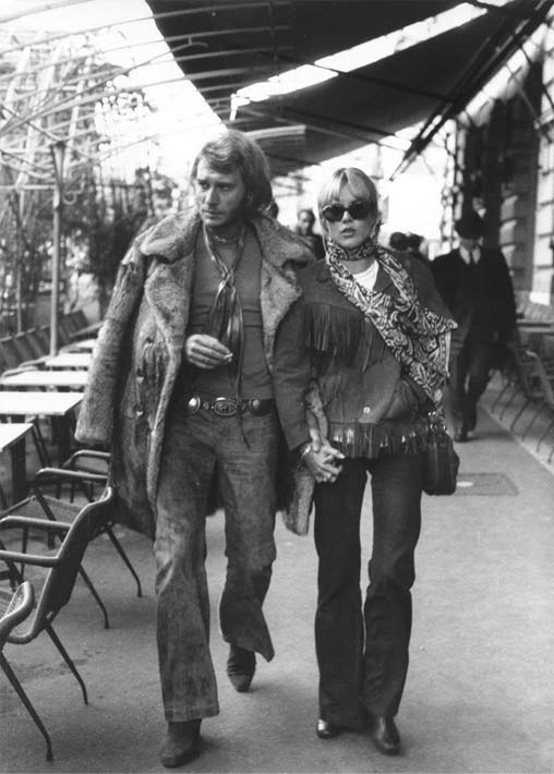 French singer, Johnny Hallyday (pictured with singer and actress Sylvie Vartan), in a stylish ensemble complete with a scarf and a fur coat in the 1970s.