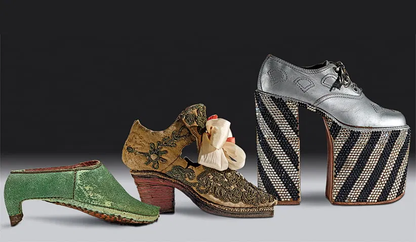A men’s 17th century Persian shoe; French or English mid-17th century shoe; 1970s platform heel worn by Elton John.