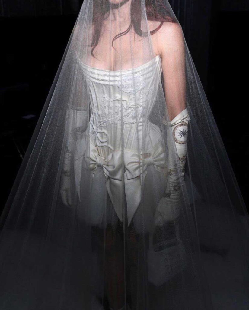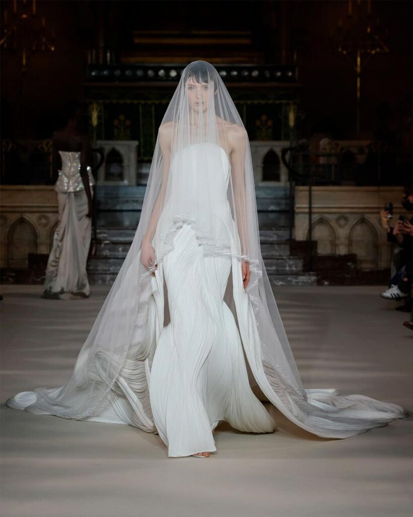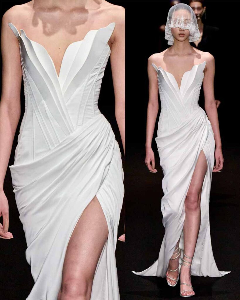 With sculptural bodices that echo statues and breastplates, bridal fashion is entering uncharted territory. In a world where fashion has grown predictable, these designs feel radical and forward–like something we’ve never seen before.