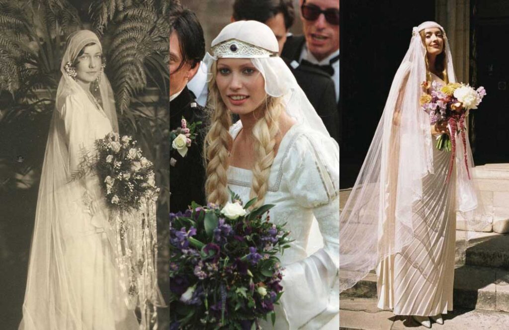 Three generations of brides–1920s, 1970s, and 2025–seperated by decades, united by style.